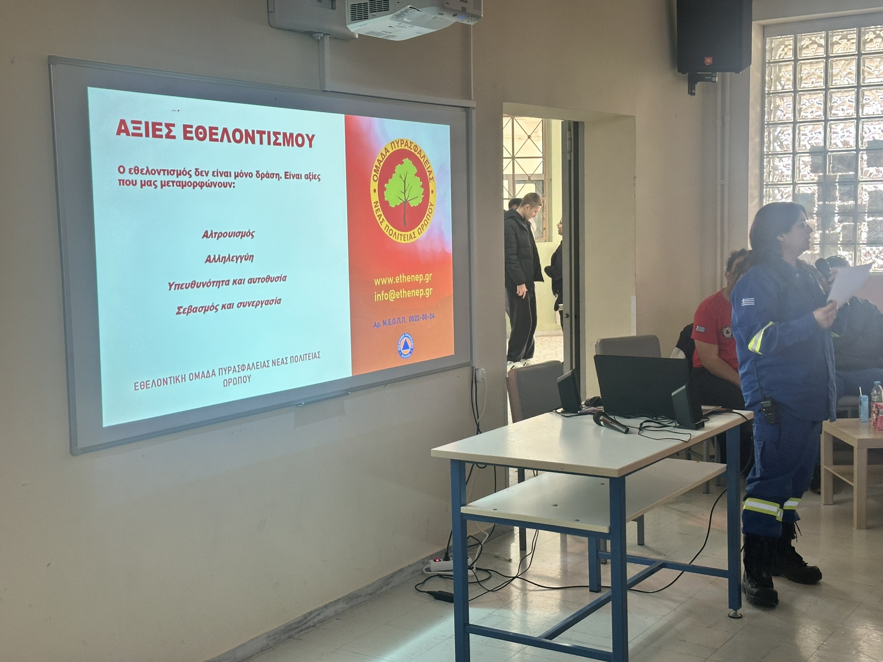 Με αφορμή την Παγκόσμια Ημέρα Εθελοντισμού (5 Δεκεμβρίου), η Εθελοντική Ομάδα Πυρασφάλειας Νέας Πολιτείας προσκλήθηκε από την κυρία Εμμανουηλίδου Σοφία να πραγματοποιήσει μία εικοσάλεπτη ενημερωτική ομιλία στο Γενικό Λύκειο Σκάλας Ωρωπού «Μίκης Θεοδωράκης», με στόχο την ενημέρωση και την ευαισθητοποίηση των μαθητών γύρω από την έννοια και τη σημασία του εθελοντισμού.